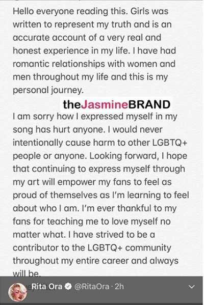 Rita Ora Issues Public Apology – I have had romantic relationships with women & men throughout my life.