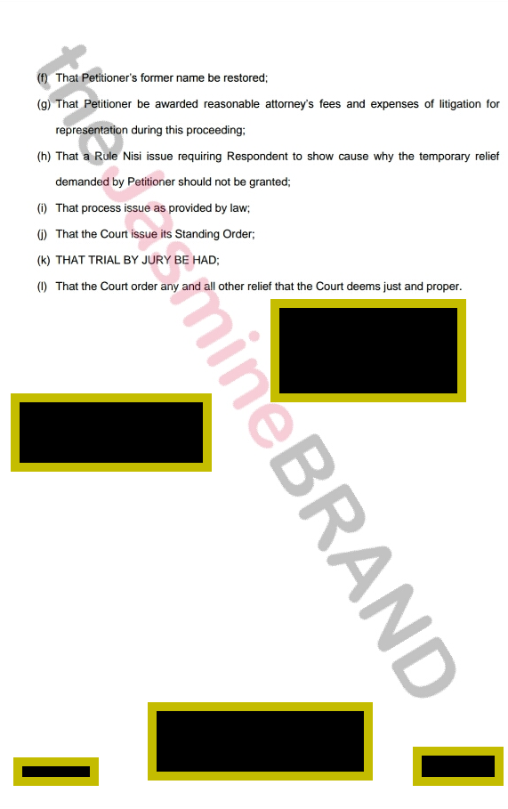 She also accuses him of adultery. Quad is also asking the court to order Greg to pay (temporary and permanent) alimony, along with equitable fair division of their property. It’s interesting to note that she asks the court that Greg be temporarily and permanently restrained from harassing her or committing any acts of violence toward her.