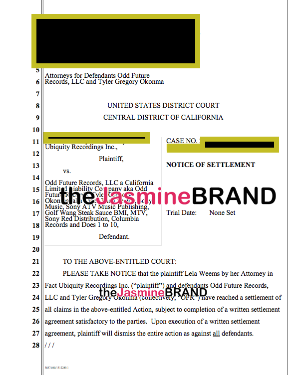 theJasmineBRAND exclusively reports, the hip hop group Odd Future and Tyler the Creator (real name Tyler Gregory Okonma) have reached a settlement to dismiss their latest lawsuit. The documents were filed on May 16th and note,