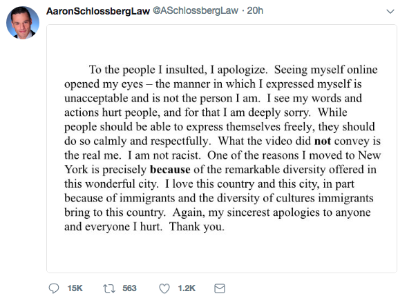 New York attorney Aaron Schlossberg says the public has him all wrong–he’s not a racist. On May 15th, a video of him went viral after he was caught on film yelling, screaming and threatening to call Immigration and Customs Enforcement (ICE) on Fresh Kitchen Deli employees who were speaking Spanish. He says people have the wrong impression of him and on May 22nd to took Twitter to offer an apology posting,