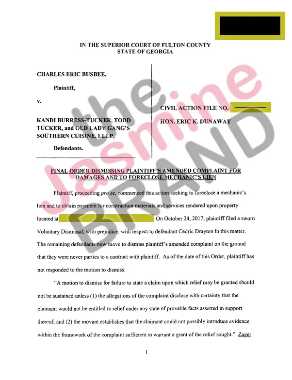 theJasmineBRAND exclusively reports, a lawsuit filed against Kandi Burruss and her Old Lady Gang restaurant has been dismissed. The plaintiff, Charles Eric Busbee, failed to respond to Kandi’s motion to dismiss. The judge dismissed the entire case last month.