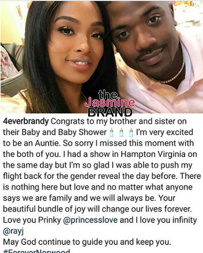 In March, the couple hosted both a baby shower and gender reveal party, where Ray J’s mother, Sonja and sister Brandy were noticeably absent. Reports surfaced that they had skipped the Love & Hip Hop: Hollywood couple’s baby shower over an argument [Click here for the backstory]. In response to this story, Brandy seems to have posted a message congratulating them on their baby shower and explaining that she had a show in Hampton, VA. She posted,