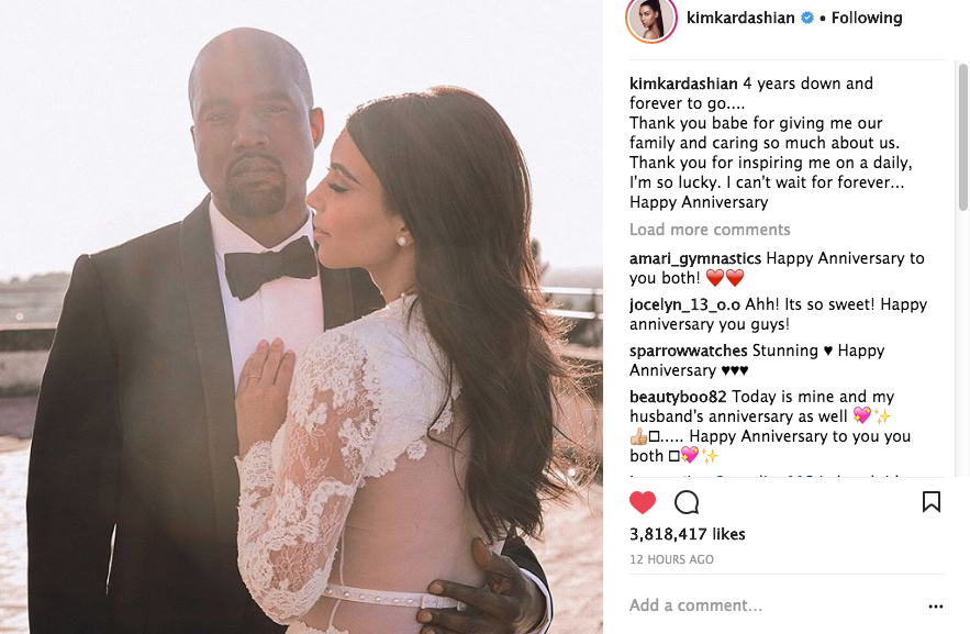 The four year anniversary comes on the heels of a challenging month of controversy surrounding Kanye and his “love” for Donald Trump. While she may disagree with many Kayne’s antics, Kim remains strongly supportive of the father of her children.