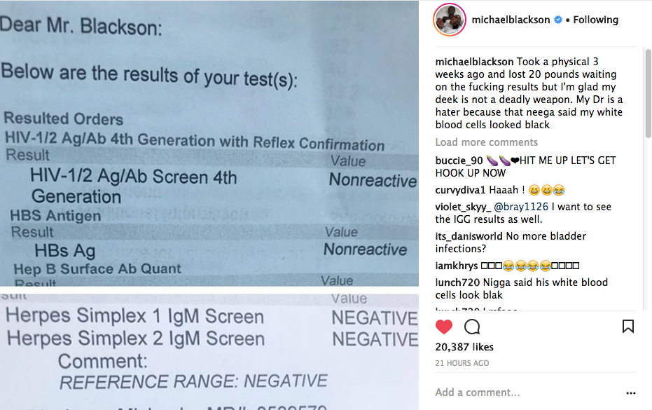Michael Blackson has never been known to shy away from airing his own and others’ dirty laundry. He posted is STDs results to his social media followers, showing a clean bill of health. He captioned: