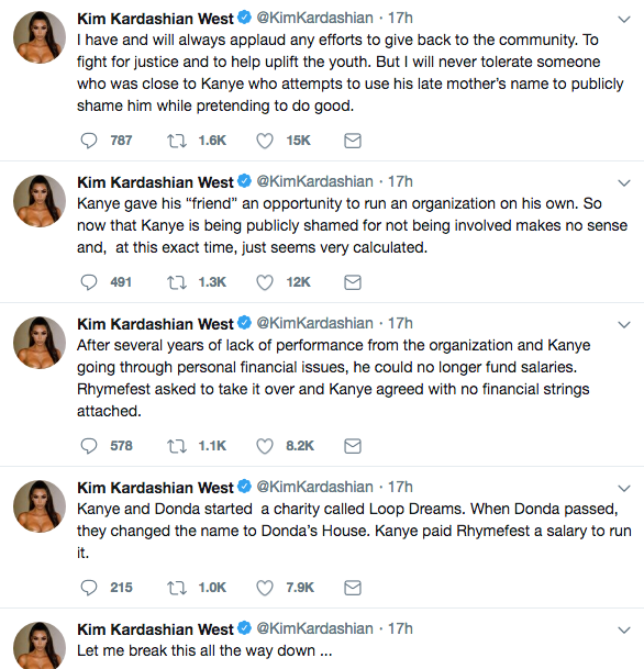 Kim Kardashian West is sticking up for her man. In a slew of aggressive tweets on Saturday, the 37-year-old Keeping Up With the Kardashians star fired back at rapper Rhymefest after he alleged that her husband, Kanye West has abandoned Donda’s House, a non-profit organization named after West’s late mother, Donda, that helps disadvantaged youth in Chicago.