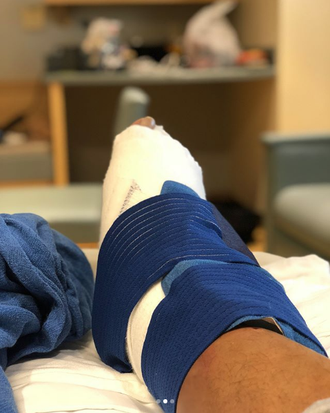 In a slideshow of images, Scrappy is seen resting as he is constricted by monitors to a hospital bed; another shows his broken foot, being wrapped in a cast; the last photo shows his bloody memorabilia.
