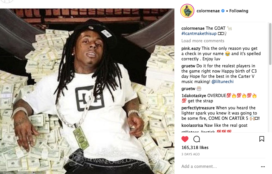 When news of the settlement broke, Lil Wayne’s daughter Reginae Carter posted an image of her father sitting on top of a lot of money to her over 3 million followers captioning it, “The GOAT #Icantmakethisup”