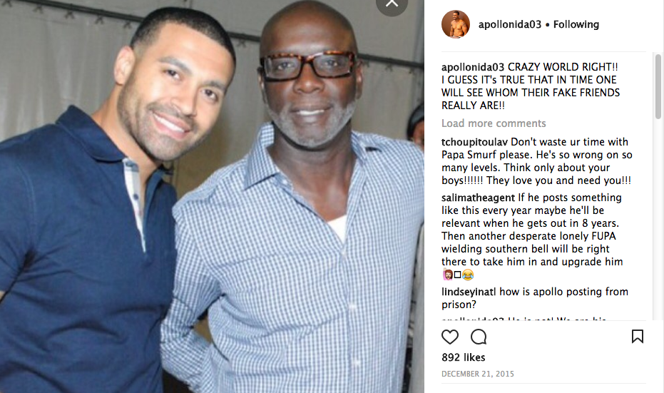 Apollo Nida definitely seems to be in high spirits. As you know, Apollo shares two children ages 5 and 8 with ex-wife Phaedra Parks, a former Real Housewives of Atlanta cast member. He is currently serving an eight year sentence after he was charged with fraud that involved bank, mail and wire fraud and ID theft of more than 50 individuals to the tune of an estimated $2 million. This week, he took to social sharing a photo of him showing off his fit body. He captioned the photo:
