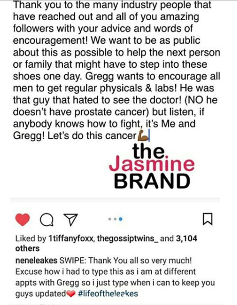 NeNe Leakes is sharing the latest on her husband, Gregg’s, health. On Wednesday, the BRAVO reality star posted a picture of her husband Greg in a doctor’s office, revealing that he was battling cancer.