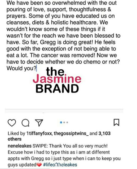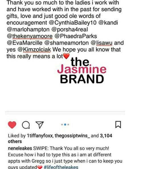 On Thursday, NeNe shared a social media message, expressing how grateful she and Greg are to receive the outpouring of support. She wrote,