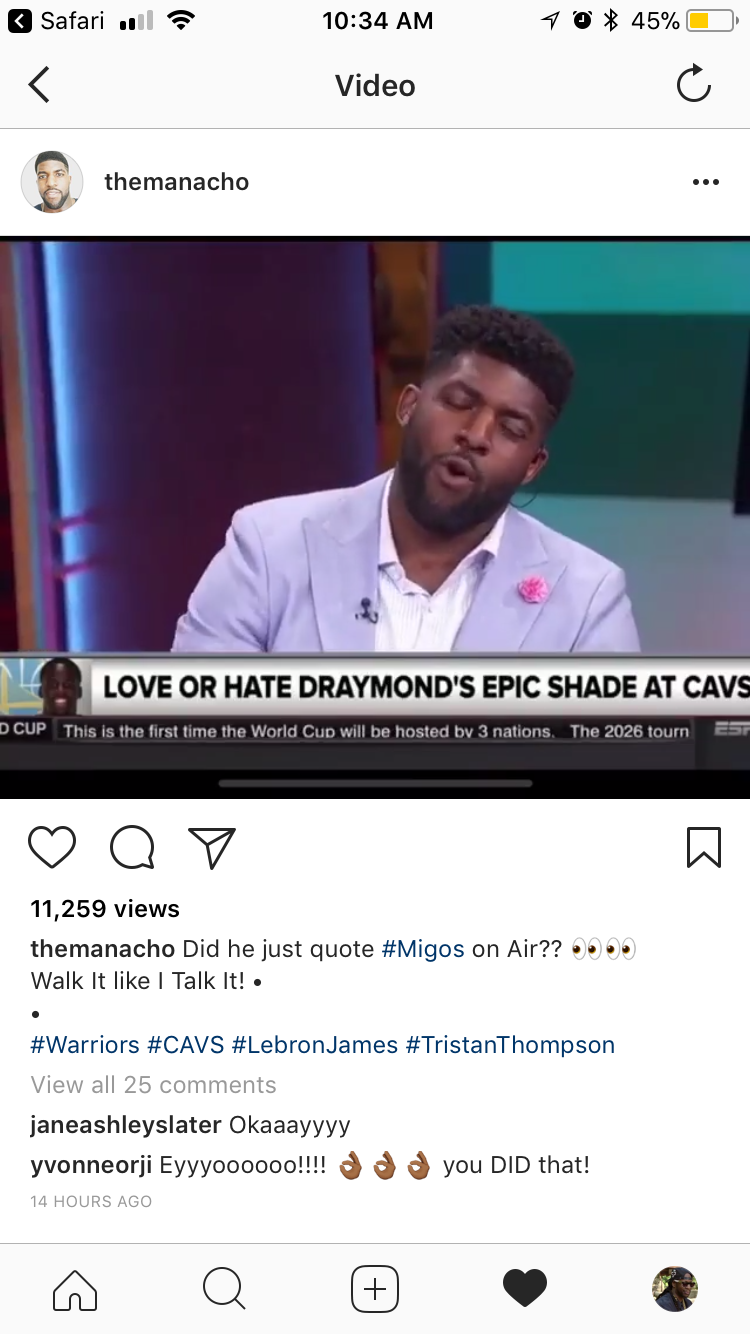 In her last video, she playfully tags on to Acho’s Migos reference by , “You be walkin’…And you talkin’ too boo [eye winking emoji]