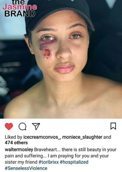 Tori’s attorney, Walter Mosley, shared a photo of Tori’s cut and bruised face.