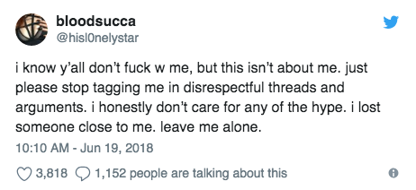 i know y’all don’t fuck w me, but this isn’t about me. just please stop tagging me in disrespectful threads and arguments. i honestly don’t care for any of the hype. i lost someone close to me. leave me alone.