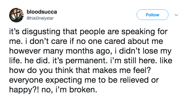 it’s disgusting that people are speaking for me. i don’t care if no one cared about me however many months ago, i didn’t lose my life. he did. it’s permanent. i’m still here. like how do you think that makes me feel? everyone expecting me to be relieved or happy?! no, i’m broken.