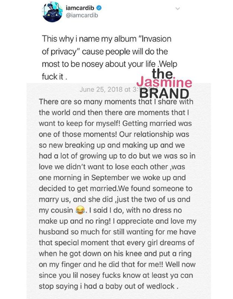 Last week, Cardi confirmed that she and Offset had secretly married. She explained why she kept the news a secret from the public.