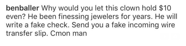 Why would you let this clown hold $10 even? He been finessing jewelers for years. He will write a fake check. Send you a fake incoming wire transfer slip. Cmon man.