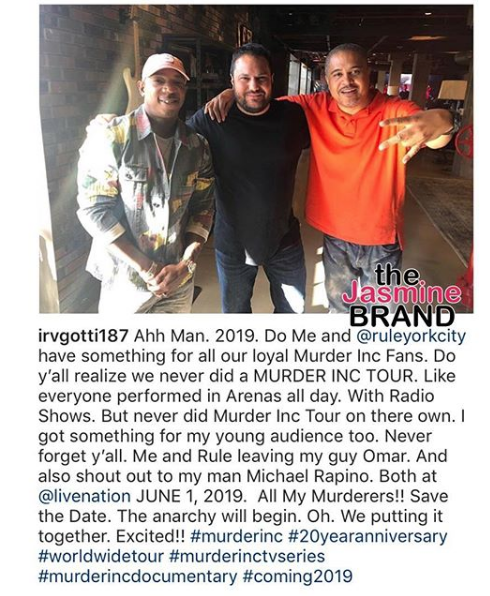 Ahh Man. 2019. Do Me and @ruleyorkcity have something for all our loyal Murder Inc Fans. Do y’all realize we never did a MURDER INC TOUR. Like everyone performed in Arenas all day. With Radio Shows. But never did Murder Inc Tour on there own. I got something for my young audience too. Never forget y’all. Me and Rule leaving my guy Omar. And also shout out to my man Michael Rapino. Both at @livenation JUNE 1, 2019. All My Murderers!! Save the Date. The anarchy will begin. Oh. We putting it together. Excited!!