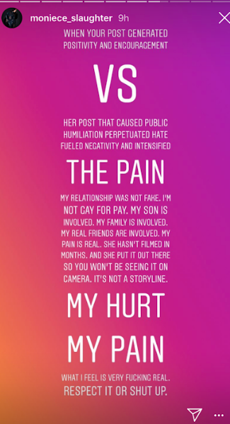 When you post generated positivity and encouragement vs her post that caused public humiliation perpetuated hate fueled negativity and intensified the pain my relationshp was not fake. I’m not gay for pay. My son is involved. My real friends are involved. My pain is real. She hasn’t filmed in months. And she put it out there so you won’t be seeing it on camera. It’s not a storyline. My hurt my pain what I feel is very f*cking real. Respect it or shut up.