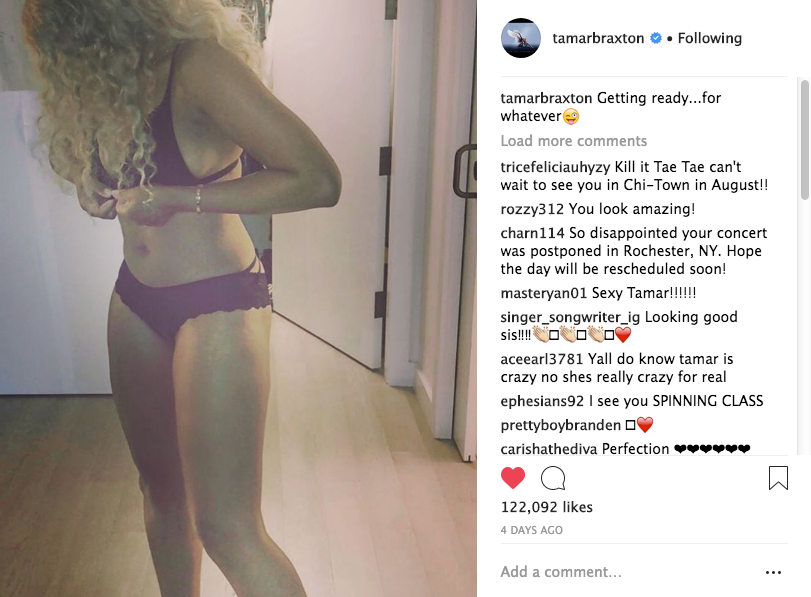 She’s known for her vocals and outspoken opinion, but now she’s serving bawdy. Tamar Braxton, 41, showed off her sexy figure recently on social media, revealing her toned curves in a black bra top and black panties. The Braxton’s Family Values reality star shared a photo of her, face down, sexily posing while she fastens her bra. Clearly enjoying this sexy moment, Tamar hid her face with long flowing blonde and brown extensions. She captioned the photo: