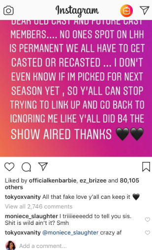 Dear old cast and future cast members…no ones spot on LHH is permanent we all have to get casted or recaster…I don’t even know if im picked for next season yet, so y’all can stop trying to link up and go back to ignoring me like y’all did b4 the show aired thanks