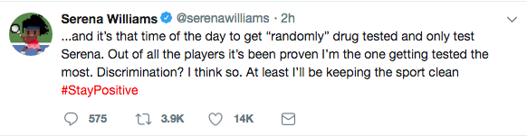 Serena Williams has taken to social media, stating that she’s unfairly being selected again to be randomly drug tested. The 36-year-old tennis champ feels that she’s being discriminated against. See her tweets below.