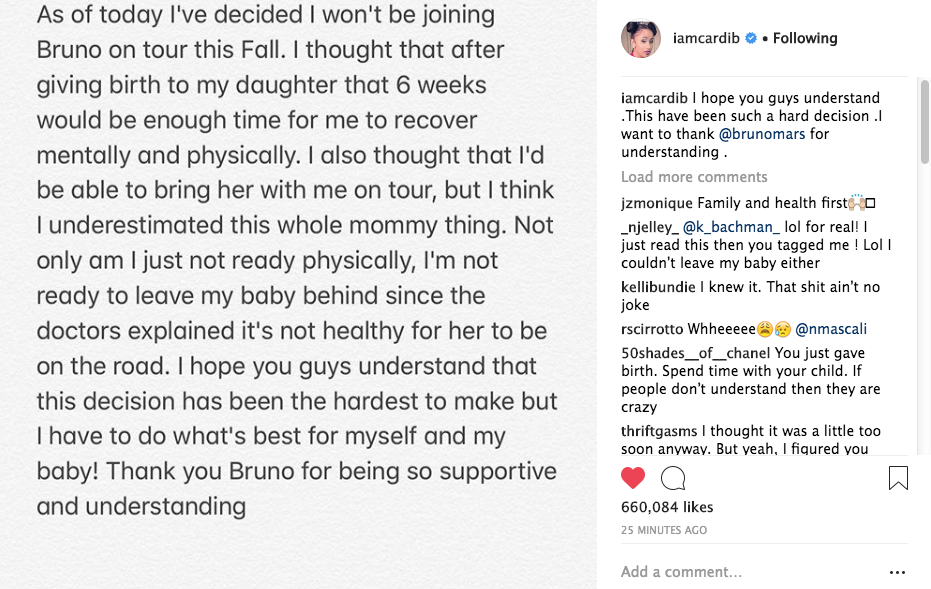 Cardi B is pulling out of her tour with Bruno Mars. The new mommy had planned to hit the road with him this year, but she’s decided not to. In a lengthy social media post, she explained that she hasn’t full recovered since delivering her daughter Kulture. She also says it’s not safe to bring her infant out on the road. See her full statement below.