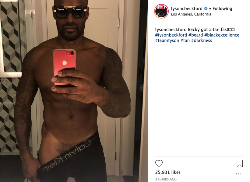 Tyson Beckford is out here setting thirst traps! This week, the 47-year-old super model showed off his toned body. Posing in the bathroom, a topless Tyson pulled down the top of his Calvin Klein underwear showing off his pubic line. According to his caption, he was showing off his tan line. He captioned the photo: