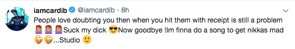 People love doubting you then when you hit them with receipt is still a problem Suck my d*ck ?Now goodbye !Im finna do a song to get nikkas mad ??…Studio ?