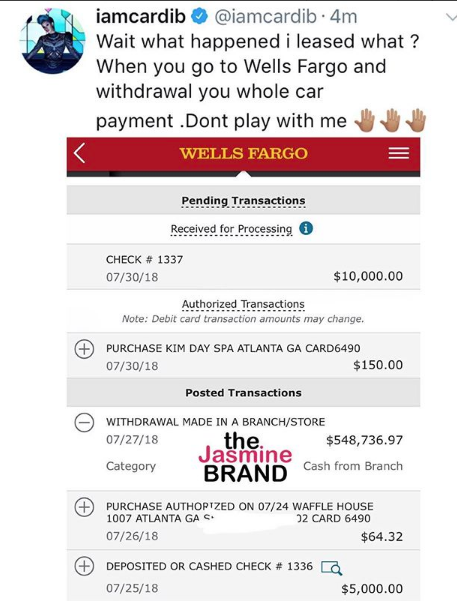 Apparently, there was some speculation as to whether or not the pricey vehicles were leased. Cardi responded by showing her bank statement that notes on July 27th, she withdrew $548,736.97 cash from Wells Fargo.