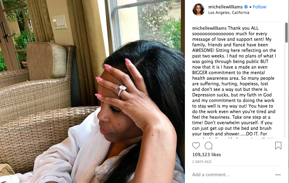 Michelle is taking the steps to better herself while at the same time encouraging fans and family to get help. In a recent IG post Williams thanks her family, friends, fans and fiancé Chad Johnson for the love and support during this time of healing. She wrote,