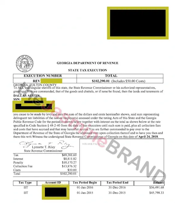 Austin has had a series of financial issues with the IRS accusing him back in 2016 of owing $661,428.81 in back taxes for multiple years.