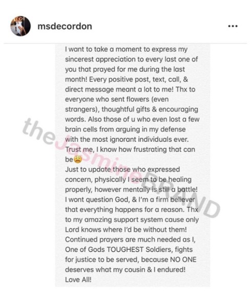 I want to take a moment to express my sincerest appreciation to every last one of you that prayed for me during the last month! Every positive post, text, call, & direct message meant a lot to me! Thx to everyone who sent flowers (even strangers), thoughtful gifts & encouraging words. Also those of u who even lost a few brain cells from arguing in my defense with the most ignorant individuals ever. Trust me, I know how frustrating that can be. Just to update those who expressed concern, physically I seem to be healing properly, however mentally is still a battle! I wont question God, & I am a firm believer that everything happens for a reason. Thx to my amazing support system cause Lord knows only where I’d be without them! Continued prayers are much needed as I, One of God’s TOUGHEST soldiers, fights for justice to be served, because NO ONE deserves what my cousin & I endured! Love all!