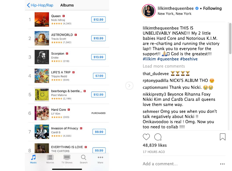 As Lil’ Kim prepares for her upcoming album, she’s also reliving in her glory days. Kim’s debut and sophomore album — “Hard Core” and “Notorious K. I. M.” — have charted on the iTunes Charts. In the Hip-Hop/Rap album category “Hardcore” holds the #6 spot, while “Notorious K. I. M.” snuck its way the #30 spot. The “Jump Off” rapper shared the news to her Instagram followers on Tuesday.