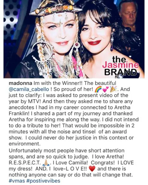 “I was asked to present video of the year by MTV! And then they asked me to share any anecdotes I had in my career connected to Aretha Franklin! I shared a part of my journey and thanked Aretha for inspiring me along the way. I did not intend to do a tribute to her! That would be impossible in 2 minutes with all the noise and tinsel of an award show. I could never do her justice in this context or environment. Unfortunately most people have short attention spans, and are so quick to judge. I love Aretha! R.E.S.P.E.C.T. “