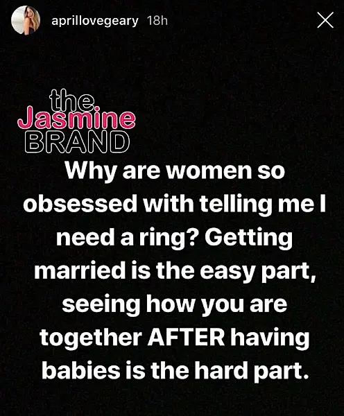 Since the baby announcement, April has received backlash about having two children before marriage to Robin. She clapped back on her Instagram story. She says: