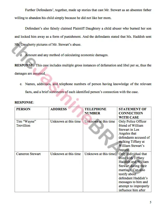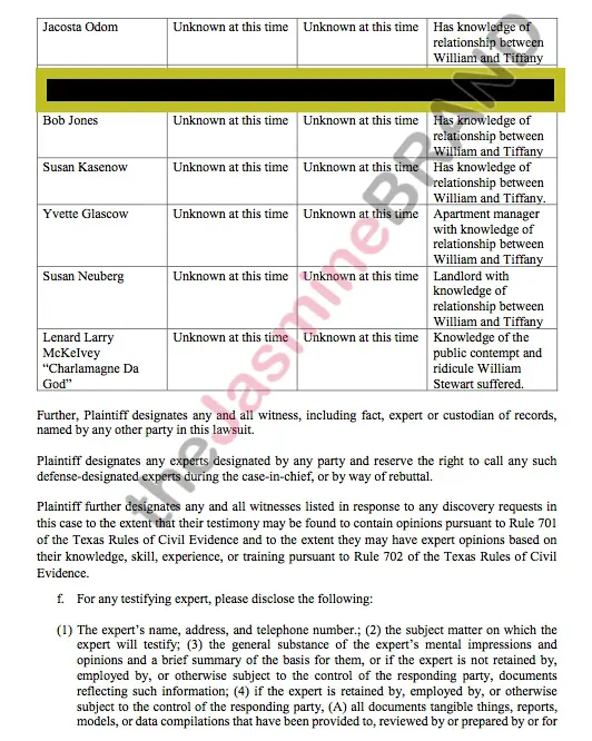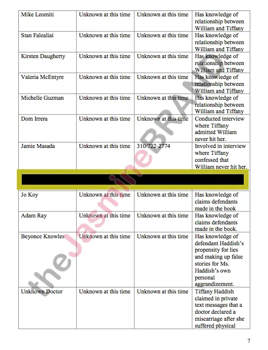According to court documents obtained by theJasmineBRAND, William and his mother have a list of potential witnesses of persons having knowledge of the relevant facts, and a brief statements of each identified person’s connection with the case.