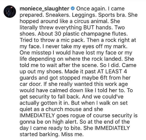 Moniece Slaughter almost got into a physical altercation while at work. The Love & Hip-Hop Hollywood reality star is claiming her co-star, Princess Love Norwood informed her to meet her after a scene, in order for Princess to remain steadfast on her word.