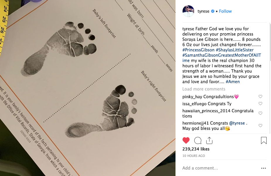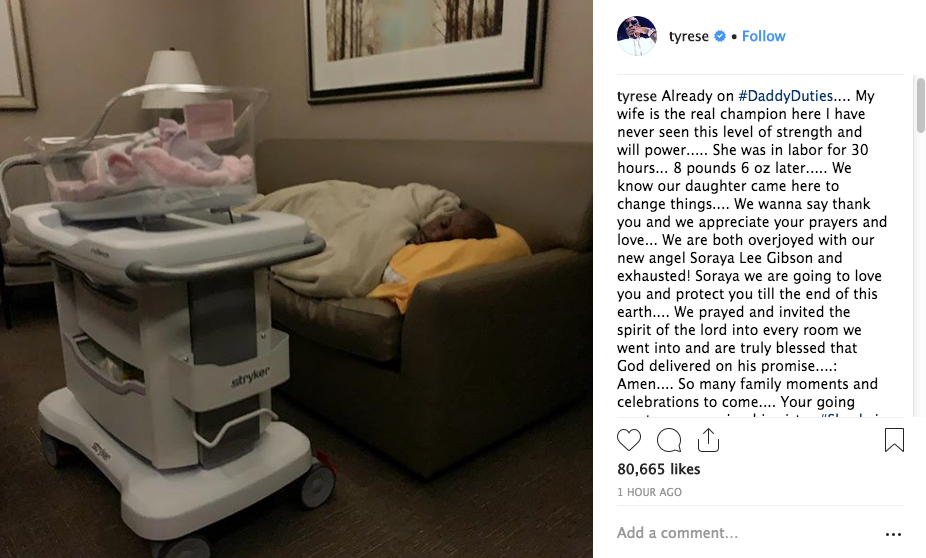 Tyrese and his wife Samantha are the proud parents of a newborn baby girl! According to the Fast & Furious actor, his wife was in labor 30 hours before delivering their daughter, Soraya Lee Gibson. Tyrese shared a photo of him sleeping next to his daughter’s crib captioning it: