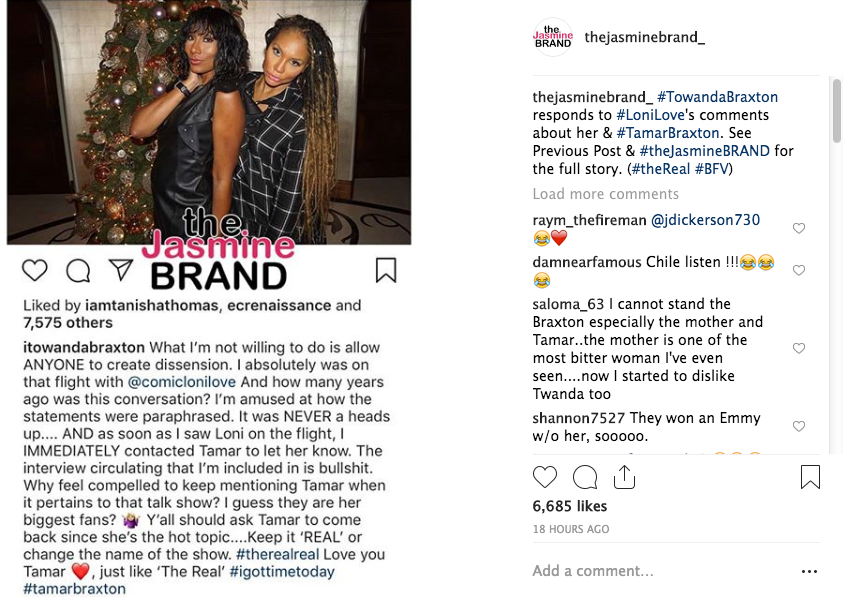 What I’m not willing to do is allow ANYONE to create dissension. I absolutely was on that flight with @comiclonilove And how many years ago was this conversation? I’m amused at how the statements were paraphrased. It was NEVER a heads up…. AND as soon as I saw Loni on the flight, I IMMEDIATELY contacted Tamar to let her know. The interview circulating that I’m included in is bullshit. Why feel compelled to keep mentioning Tamar when it pertains to that talk show? I guess they are her biggest fans? ????? Y’all should ask Tamar to come back since she’s the hot topic….Keep it ‘REAL’ or change the name of the show. #therealreal Love you Tamar ??, just like ‘The Real’ #igottimetoday #tamarbraxton