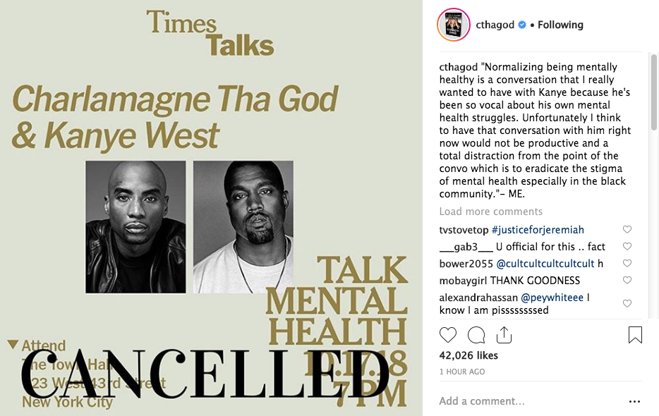 “Normalizing being mentally healthy is a conversation that I really wanted to have with Kanye because he’s been so vocal about his own mental health struggles. Unfortunately I think to have that conversation with him right now would not be productive and a total distraction from the point of the convo which is to eradicate the stigma of mental health especially in the black community.”- ME.