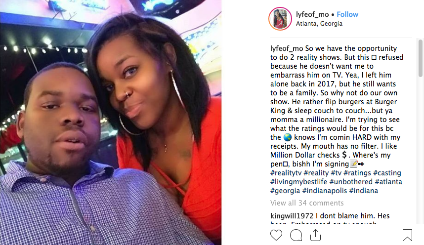 So we have the opportunity to do 2 reality shows. But this ? refused because he doesn’t want me to embarrass him on TV. Yea, I left him alone back in 2017, but he still wants to be a family. So why not do our own show. He rather flip burgers at Burger King & sleep couch to couch…but ya momma a millionaire. I’m trying to see what the ratings would be for this bc the ? knows I’m comin HARD with my receipts. My mouth has no filter. I like Million Dollar checks?. Where’s my pen?, bishh I’m signing?