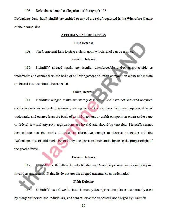“Khaled and his son by using and applying to register the trademarks ASAHD, ASAHD COUTURE, A.S.A.H.D.A SON AND HIS DAD and WE THE BEST LIFESTYLE in connection with purported clothing and magazine publishing businesses and by using Khaled’s name performing name as hashtags to direct internet traffic to Defendant’s products.”