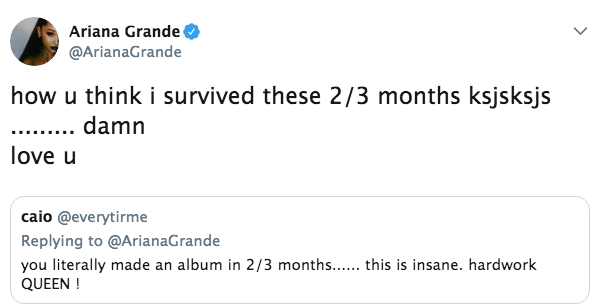 Surprisingly, Ariana is even hinting at a new upcoming album already! “Sweetener” was just released in August of this year. Twitter user @everytirme commented on how quickly she’s been able to work: