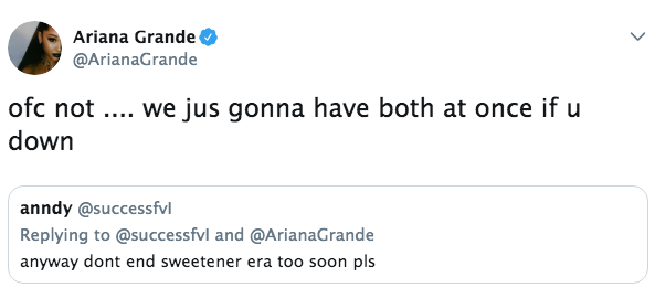 Twitter user @successfvl mentioned Ariana Grande with concerns that her album, “Sweetener,” will be neglected in order to promote the upcoming project. They said: