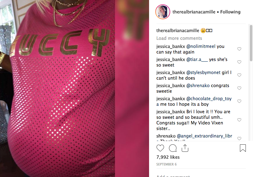 If you scroll down the former military mama’s page, you can see a previous pic of Briana in the same hot pink mesh Gucci top, with a burgeoning baby bump underneath! Aww!