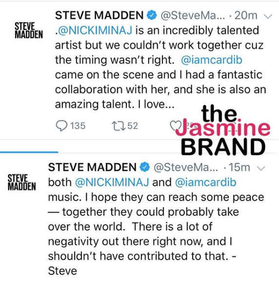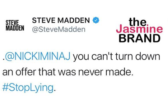 Nicki Minaj has responded to a controversial tweet made by Steve Madden. As previously reported, Madden raised a few eyebrows when it appeared that he chose sides between Minaj and Cardi by denying he ever offered her (Minaj a deal).