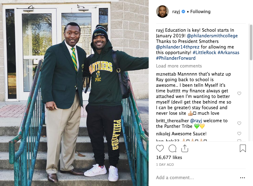 Ray J is taking his talents to school! The 37-year-old reality star will be attending Philander Smith College, a HBCU located in Little Rock, Arkansas. He will begin January 2019. Ray J shared the news on social media after speaking at the university. Posing with the university president he writes,