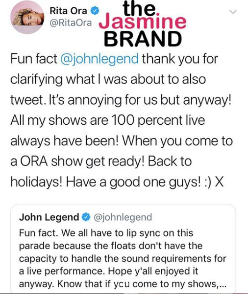 Rita Ora Accused of Lip Syncing, Singer Blames Macy’s + John Legend Defends Her