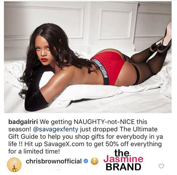 Chris Brown may be attempting to shoot his shot. Over the weekend, we spotted the 29-year-old singer low key flirting with ex girlfriend Rihanna. The 30-year-old singer, model and actress shared an image on social media, promoting her new holiday line for Savage Fenty. She captioned the promo shot,