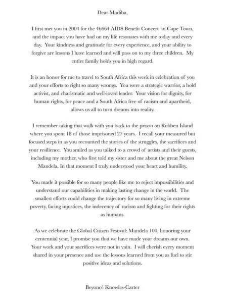 This year’s Global Citizen Festival is exceptionally significant because, in 2018, political leader and philanthropist Nelson Mandela would have been 100 years old. This milestone is significant to Beyoncé due to the impact Mandela had on her life. She shared an open letter to Mandela, ahead of her appearance at the festival.